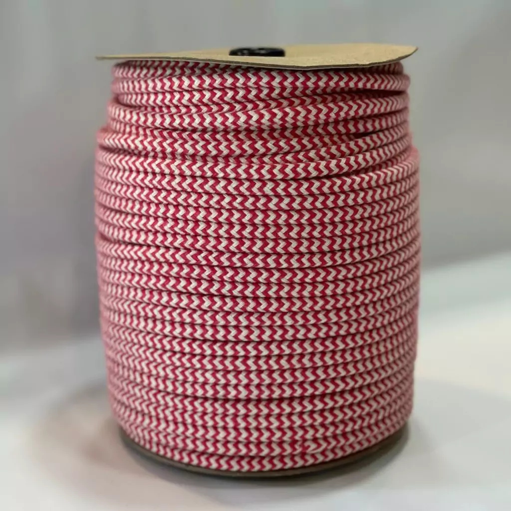 Cuerda trenzada de algodon PREMIUM con Alma de pabilo, en color crudo con fucsia. Son muy rendidores e ideales para todo lo que es cesteria nordica.