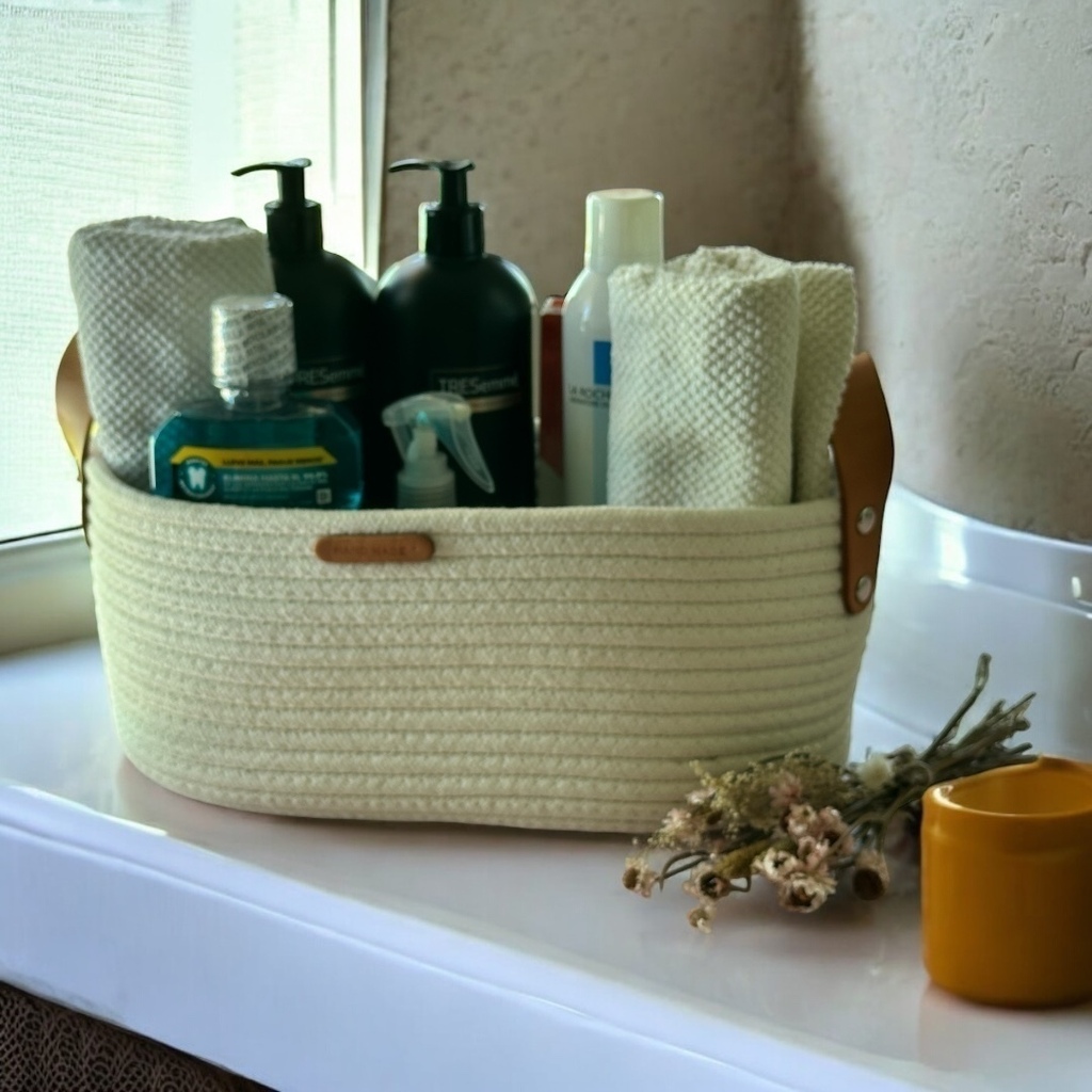 El Cesto Ovalado Organizador de 35 cm de diámetro x 22 cm de alto es la solución ideal para mantener todo en orden y con estilo. Perfecto para el baño, la cocina o como porta pañalero, te va a ayudar a guardar cosméticos, juguetes o cualquier cosa que necesites tener a mano.